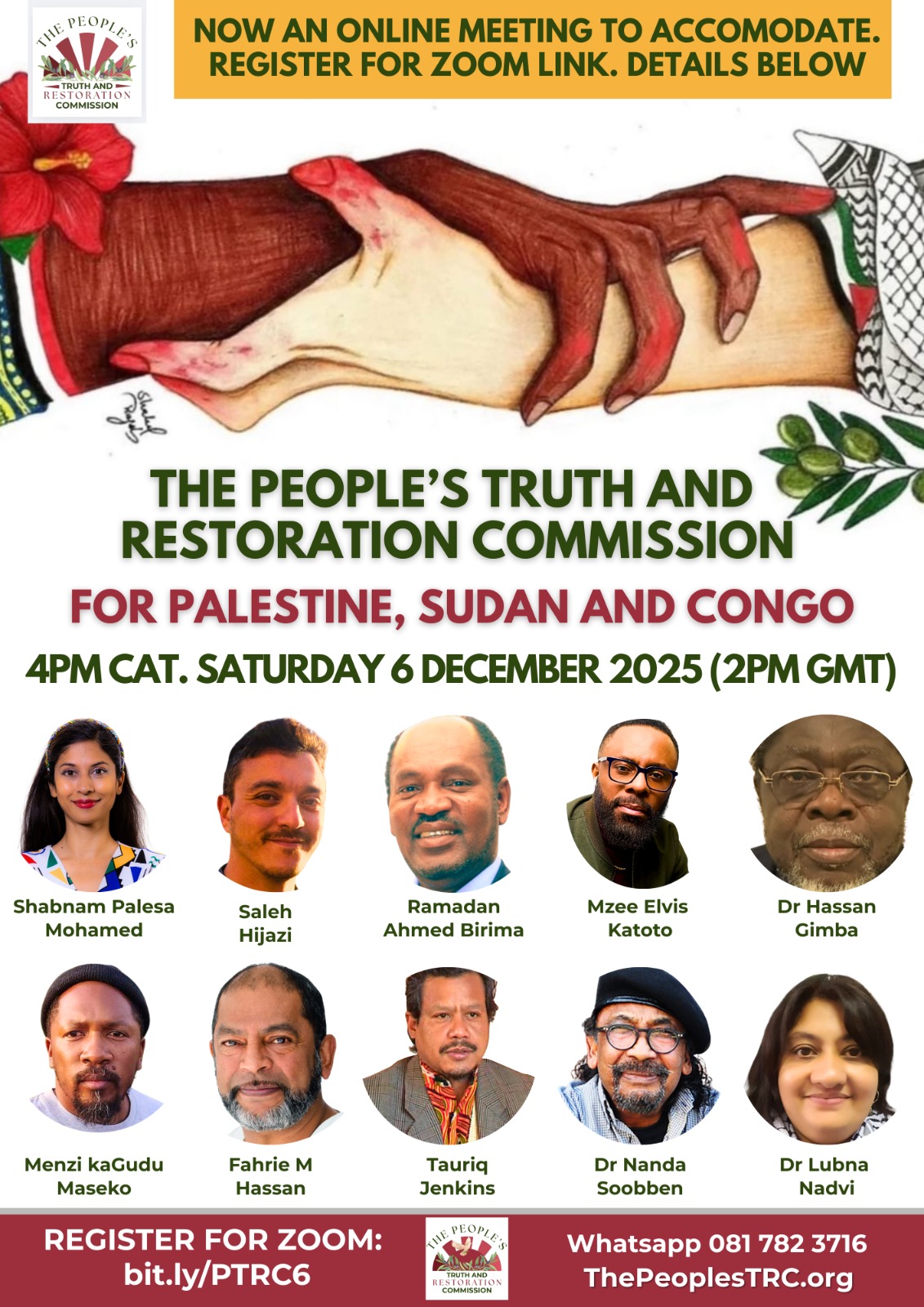 لجنة الحقيقة والاستعادة الشعبية مبادرة مستقلة وتحويلية، مبنية على مبادئ أوبونتو والصمود وحقوق الإنسان. تسعى إلى توثيق الحقيقة، والدعوة إلى العدالة التصالحية، وتعزيز التضامن. ستركز لجنة الحقيقة والاستعادة الشعبية في دورتها الافتتاحية على الشعب الفلسطيني والسوداني والكونغو.