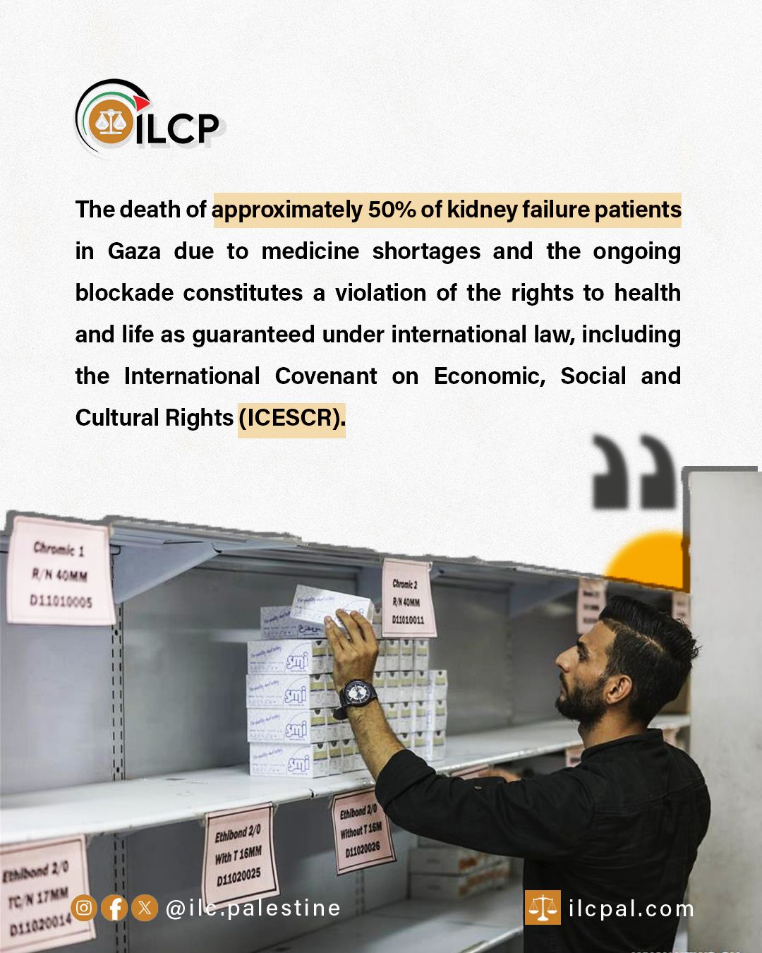 The death of nearly 50% of kidney failure patients in Gaza due to medicine shortages and the ongoing blockade constitutes a grave violation of the right to health and the right to life under international law, including the ICESCR